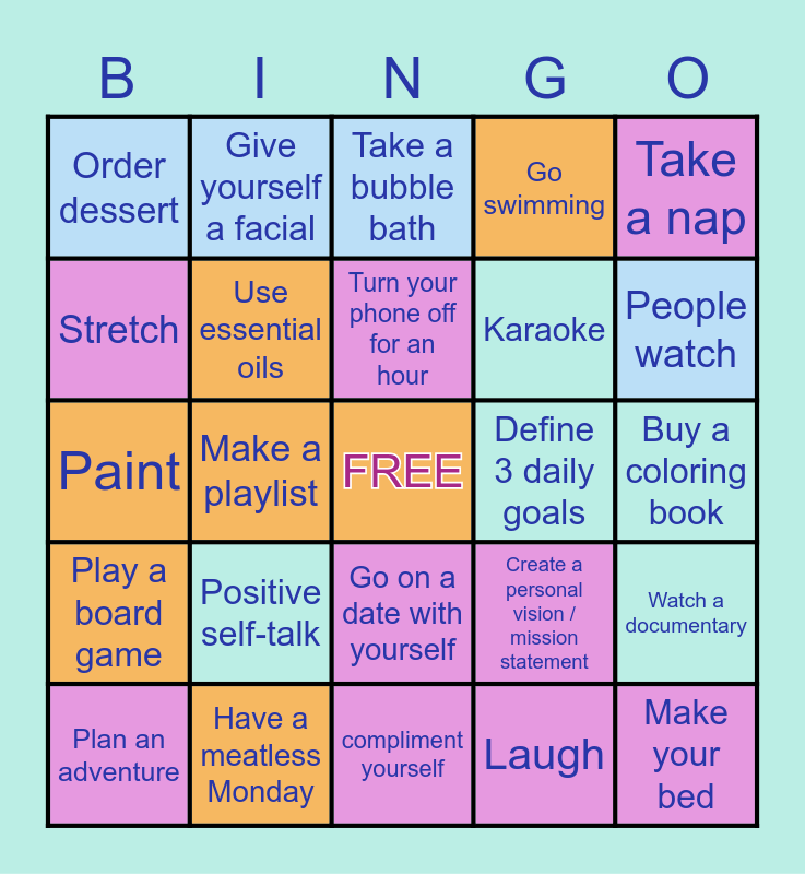 This bingo card has a free space and 224 words: Read a book, Go to bed early, Take a bubble bath, Appreciate your strengths, Ask teammate a non-work question, Yoga, Mindfulness, Take a personal day, Deep breathing, Take a nap, Write it down, Coloring, Drink water, Read a magazine or book, Self-help podcast, Write a letter, Write in a journal, Not checking work email at home, Compliment a colleague, Make a vision board, Practice gratitude, Exercise, Dance, Bake something for yourself, Play a board game, Appreciate your strengths, Call a family member, Cuddle a pet, Buy a coloring book, Exercise, Say yes to something fun, Listen to a podcast, Sent mail to my future self, Declutter your wardrobe, Do something spontaneous, Listen to music, Turn your cell phone off, Digital detox, Participate in a hobby, Deep breathing, Create art, Light a candle, Go swimming, Read a magazine, Don’t be afraid to cancel plans, Give yourself a facial, Massage, Make a smoothie, Jump on a trampoline, Puzzle, Declutter room or small space, Write a positive review, Talk to someone you trust, Make your bed, Drink cup of tea, Make a playlist, Forgive others, Visit a museum, Create a fun to-do list, Manicure, Volunteer, Took a Social Media Break, Allow yourself to make mistakes, Stop being your harshest critic, Plan an adventure, Tell your pet your darkest secrets, Unfollow and unfriend, Pay for stranger’s coffee, Make popsicles, Watch the clouds, Garden, Don’t hit snooze, Define 3 daily goals, Get some natural light, Donate to a charity, Walk barefoot in grass, Set personal boundaries, Spend time in nature, Go for a bike ride, Go camping, Go backpacking, Let go of what no longer serves you, Meditate, Go for a run, Stretch, Go for a hike, Try Tai Chi, Pet a dog, Stargaze, Reward yourself, Foam roll, Create a pinterest board, Try a new hairstyle, Play a prank, Lay out clothes for tomorrow, Try acupuncture, Go on a date with yourself, Go on a walk, Go on a date, Organize your computer files, Read poetry, Hug someone, Leave a whole day unplanned, Turn off notifications, Self-reflection, Get adequate amount of sleep, Check your horoscope, Treat yo'self, Create a morning routine, Reconnect with an old friend, Eat well, Take your vitamins, Go to a comedy club, Go to an antique shop, Go to a farmers market, Make a blanket fort, Try something new, Learn a coping skill, Create something, Be OK w/ asking for help, Reread a favorite book, Sauna, Relax to sounds of nature, People watch, Make a fruit salad, Learn a dance, Sing at top of lungs, Karaoke, Sleep in, Aromatherapy, Visit a hot spring, Watch a movie, Watch funny YouTube videos, Prepare a healthy meal, Paint, Bake some bread, Moisturize, Listen to happy music, Visit library, Go for a walk, Use essential oils, Buy new sheets, Enjoy a hot shower, Watch a documentary, Relax in a hammock, Pick some wildflowers, Have a bonfire, Take pictures of nature, Floss, Wear earplugs, Practice vulnerability, Create bucket list, Look at old photos, Open your windows, Meal prep planning, Watch television, Go outside, Get dressed up, Purge closet, Order dessert, Pack your lunch, compliment yourself, Try a new recipe, Start Christmas savings fund, Send an overseas care package, Count your blessings, Host a party, Laugh, Pop bubble wrap, Retail Therapy, Free write, Eat away from your desk, Celebrate a small win, Eat Dessert first, Helped someone else, Turned off the news, Floss, Wear sunscreen, Recycle, Take deep breaths, Listened to your body, Give yourself a foot massage, Paint, Sketch outside, Go for a jog, Dance like nobody's watching, Watch a favorite childhood movie, Forgive others, Donate to a food pantry, Donate to an animal shelter, Donate to a women's shelter, Completed a DIY project, Call someone just to say "hi”, Look at the night sky, Camp, Have a meatless Monday, Turn your phone off for an hour, Take 10 deep breaths, Write a poem, Positive Affirmations, Positive self-talk, Go to therapy, Stretch, Set boundaries, De-clutter something, Get a medical exam, By yourself flowers/plant, Got a haircut, Pause for 5 minutes, Forgive Yourself, Identify Stressors, Do something you loved as a child, Reduce commitments, Visit a museum, Let go of perfectionism, Go to your happy space, Create a gratitude list, Tidy living space, Pajama Day, Join a cause you care about, Pedicure, Learn a new skill, Create a personal vision / mission statement and Rest.