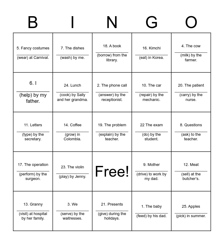 This bingo card has 26 words: Free!, 1. The baby _______________ (feed) by his dad., 2. The phone call _______________ (answer) by the receptionist., 3. We _______________ (serve) by the waitresses., 4. The cow _______________ (milk) by the farmer., 5. Fancy costumes _______________ (wear) at Carnival., 6. I ____________ (help) by my father., 7. The dishes _______________ (wash) by me., 8. Questions _______________ (ask) to the teacher., 9. Mother _______________ (drive) to work by my dad., 10. The car _______________ (repair) by the mechanic., 11. Letters _______________ (type) by the secretary., 12. Meat _______________ (sell) at the butcher’s., 13. Granny _______________ (visit) at hospital by her family., 14. Coffee _______________ (grow) in Colombia., 15. The trousers _______________ (iron) by John., 16. Kimchi _______________ (eat) in Korea., 17. The operation _______________ (perform) by the surgeon., 18. A book _______________ (borrow) from the library., 19. The problem _______________ (explain) by the teacher., 20. The patient _______________ (carry) by the nurse., 21. Presents _______________ (give) during the holidays., 22 The exam _______________ (do) by the student., 23. The violin _______________ (play) by Jenny., 24. Lunch _______________ (cook) by Sally and her grandma. and 25. Apples _______________ (pick) in summer..