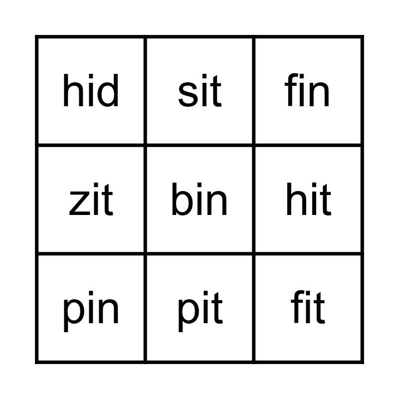 This bingo card has a free space and 8 words: hit, fin, sit, pin, hid, fit, zit and pit.