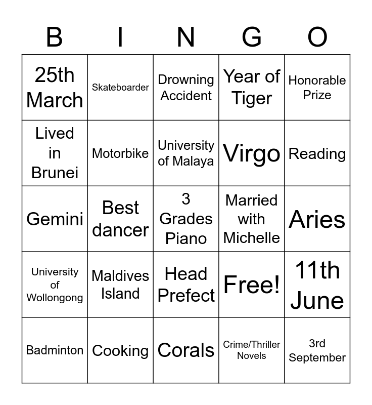 This bingo card has 27 words: Free!, 3rd September, Virgo, Corals, Lived in Brunei, Drowning Accident, Skateboarder, University of Wollongong, Married with Michelle, 11th June, Gemini, Year of Tiger, Badminton, Cooking, Reading, Coffee, Motorbike, University of Malaya, Maldives Island, 25th March, Aries, Crime/Thriller Novels, Best dancer, 3 Grades Piano, Head Prefect, Honorable Prize and Dean’s and Present’s List.