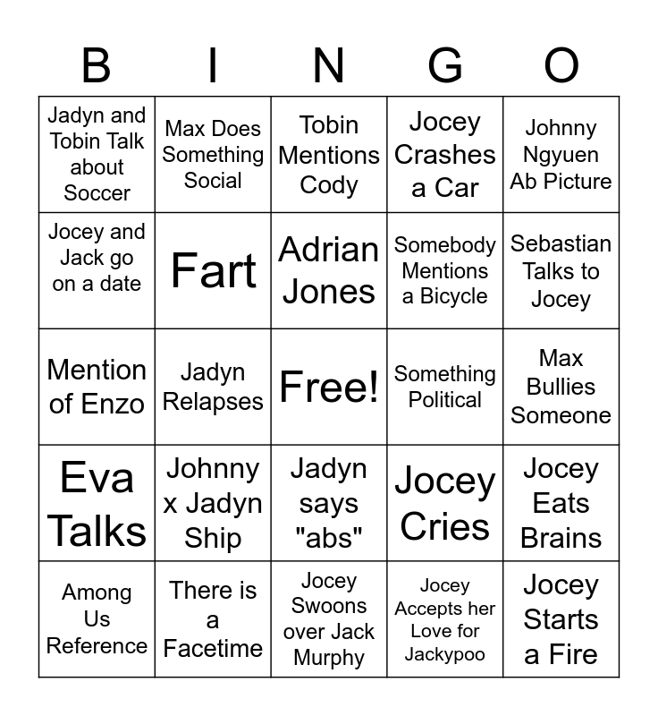 This bingo card has a free space and 27 words: Jocey Cries, Jadyn Cries, Somebody Mentions a Bicycle, Jocey Swoons over Jack Murphy, Jocey and Jack go on a date, Tobin Mentions Cody, Max Does Something Social, Eva Talks, Something Political, Jocey Eats Brains, Mention of Enzo, Jocey Crashes a Car, Among Us Reference, There is a Facetime, Sebastian Talks to Jocey, Tobin Plays Video Games on FaceTime, Fart, Adrian Jones, Johnny x Jadyn Ship, Jadyn and Tobin Talk about Soccer, Max Bullies Someone, Jocey Accepts her Love for Jackypoo, Jadyn Relapses, Jocey Starts a Fire, Jadyn says "abs", Johnny Ngyuen Ab Picture and Cody Brown Abs Picture.