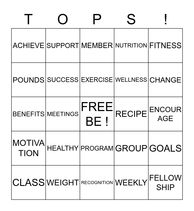 This bingo card has a free space and 24 words: HEALTHY, WEIGHT, EXERCISE, CLASS, FITNESS, ACHIEVE, POUNDS, SUPPORT, RECIPE, PROGRAM, WELLNESS, BENEFITS, GROUP, GOALS, SUCCESS, WEEKLY, ENCOUR AGE, MEMBER, CHANGE, MEETINGS, FELLOW SHIP, MOTIVA TION, NUTRITION and RECOGNITION.