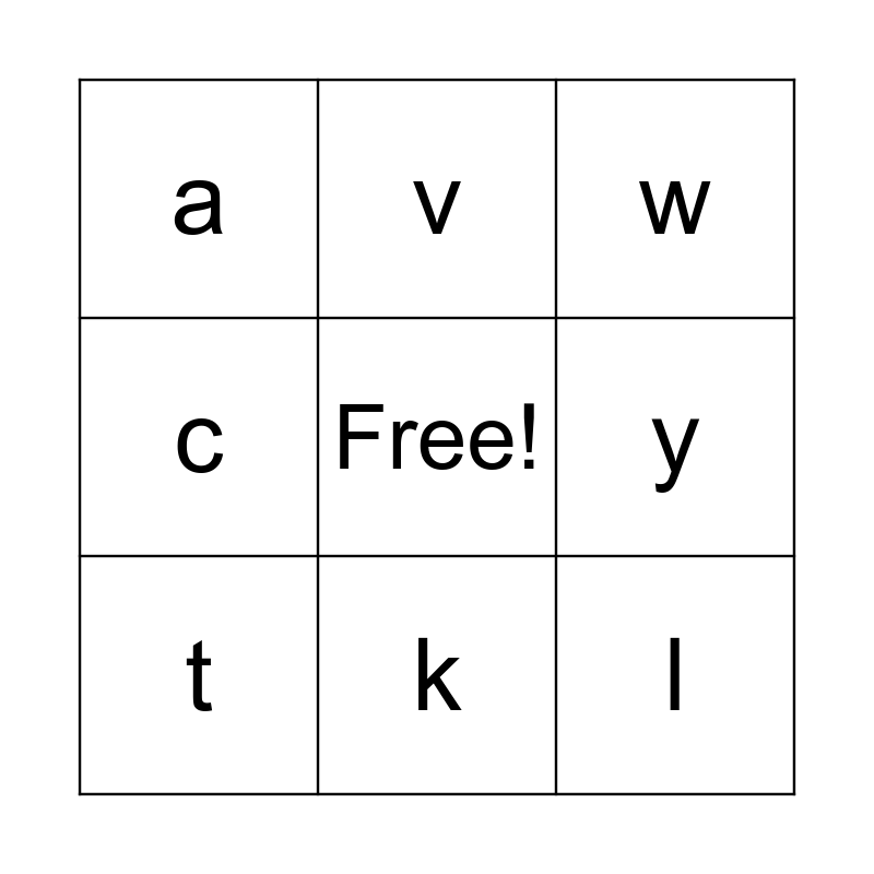 This bingo card has a free space and 11 words: i, k, l, t, v, w, y, z, c, a and e.