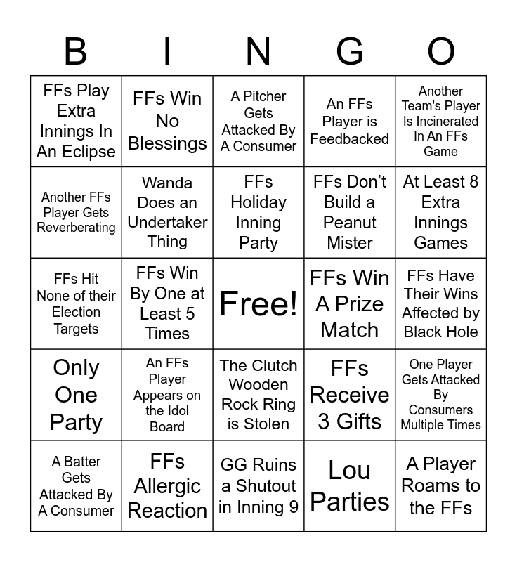 This bingo card has a free space and 61 words: FFs Reverb, FFs Allergic Reaction, Less Than 5 Days of Partytime, Only One Party, Lou Parties, FFs Player’s Peanut Allergy Gets Cured, Wanda Does an Undertaker Thing, FFs Attract an Attractor, FFs Don’t Build a Peanut Mister, FFs Play a Wildcard Series, An FFs Player is Feedbacked, FFs Don’t Qualify for any Postseason Brackets, Another FFs Player Gets Reverberating, FFs Avoid Consumer Attacks, Tigers Ambush Another FFs Player, FFs Play Extra Innings In An Eclipse, A Player Roams to the FFs, Another Team's Player Is Incinerated In An FFs Game, FFs Get Two Wills With <1% Likelihood, FFs Holiday Inning Party, FFs Win A Prize Match, A Pitcher Gets Attacked By A Consumer, A Batter Gets Attacked By A Consumer, One Player Gets Attacked By Consumers Multiple Times, Gita Enters The Secret Base, Socks Does A Sick Rail Grind, No Pitchers Get Faxed, An Ex-FFs Player Rejoins The Team, At Least 8 Extra Innings Games, Isaac Sips, An FFs Player Is Redacted via Consumer Attacks, Qais Dogwalker, FFs Are First To Trigger A New Mechanic, An FFs Player Gets A Pair Of Sunglasses, FFs Win No Blessings, FFs Win A Blessing They Weren't Going For, Goobie Changes Teams In The Election, FFs Win By One at Least 5 Times, Mags Roams to a New Team, FFs Hit None of their Election Targets, FFs Defy BNN, An FFs Player Appears on the Idol Board, FFs Have Their Wins Affected by Black Hole, A Ballpark Modification Is Ratified, FFs Receive 3 Gifts, FFs Steal at Least 5 Runs From Tunnels, An FFs Player Parties More Than Once, Isaac Loses his Glove, Wes Moves to the Lineup, The Clutch Wooden Rock Ring is Stolen, GG Ruins a Shutout in Inning 9, Conrad Gives Up Exactly 12 Runs, A Player Bats Themself In, K-Rod Allows a Black Hole or Sun 2 Loop, Baby Hits a Run Into a Big Bucket, Justice Eats Fire, FFs End The Regular Season Between 40 and 50 Losses, Duffy Shells Someone, Geepa Steals a Base, Baby Doesn’t Lose their Rock Bat and Swamuel Steals 4th Base.