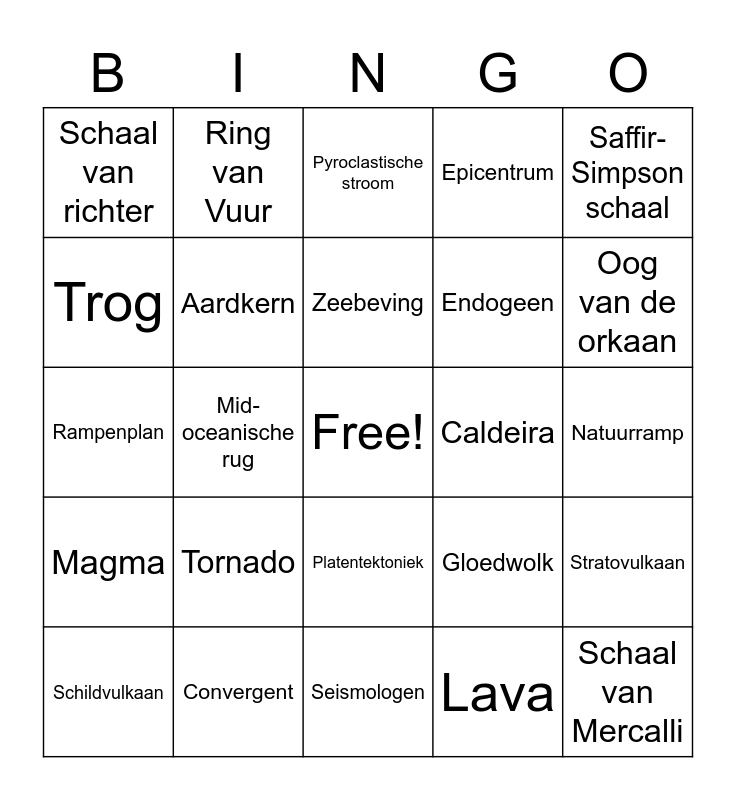 This bingo card has a free space and 59 words: Convectiestromen, Convergent, Divergent, Magma, Lava, Aardmantel, Aardkern, Aardkorst, Endogeen, Exogeen, Epicentrum, Hypocentrum, Trog, Subductie, Transform, Schaal van richter, Schaal van Mercalli, Saffir-Simpson schaal, Tsunami, Zeebeving, Caldeira, Pyroclastische stroom, Schildvulkaan, Stratovulkaan, Tufsteen, Dimensie, Evacueren, Hazard management, Oog van de orkaan, Cycloon, Tyfoon, Hurricane, Schaal van Beaufort, Aardbeving, Ring van Vuur, Continentale plaat, Oceanische plaat, Mid-oceanische rug, Bouwkundige maatregelen, Rampenplan, Hitte, Tornado, Natuurramp, Aardverschuiving, Orkaan, Platen, Schollen, Breuken, Platentektoniek, Seismologen, Magmakamer, Geothermisch, Eruptie, Krater, Vulkaan, Gloedwolk, Modderstromen, Reliëf and Geiser.