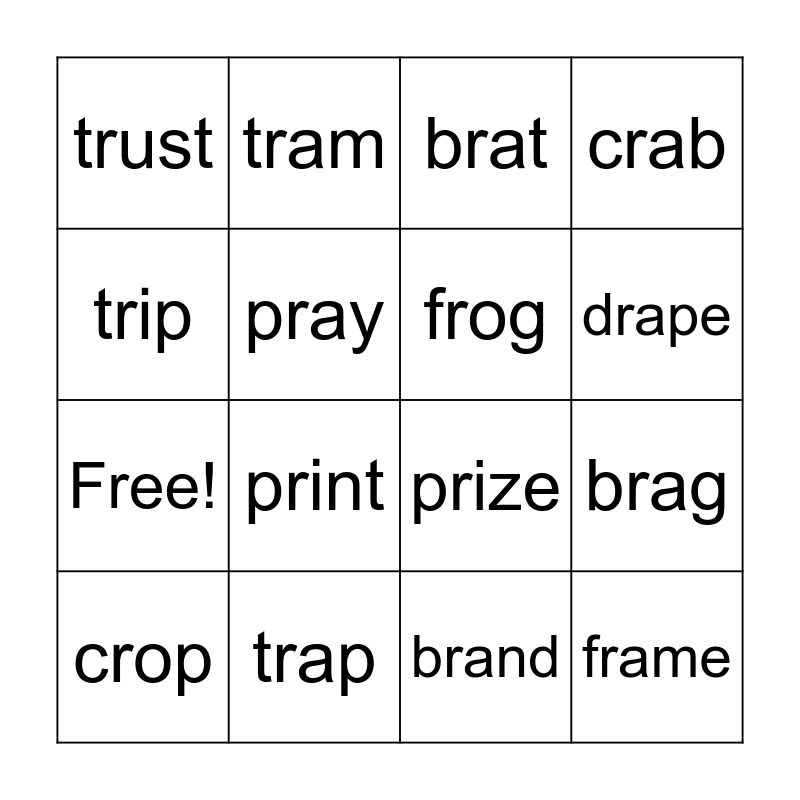 This bingo card has 20 words: brag, Brad, brat, crib, crop, trip, trap, trust, Free!, tram, print, prize, pray, frame, frog, drill, drape, crab, brand and tribe.