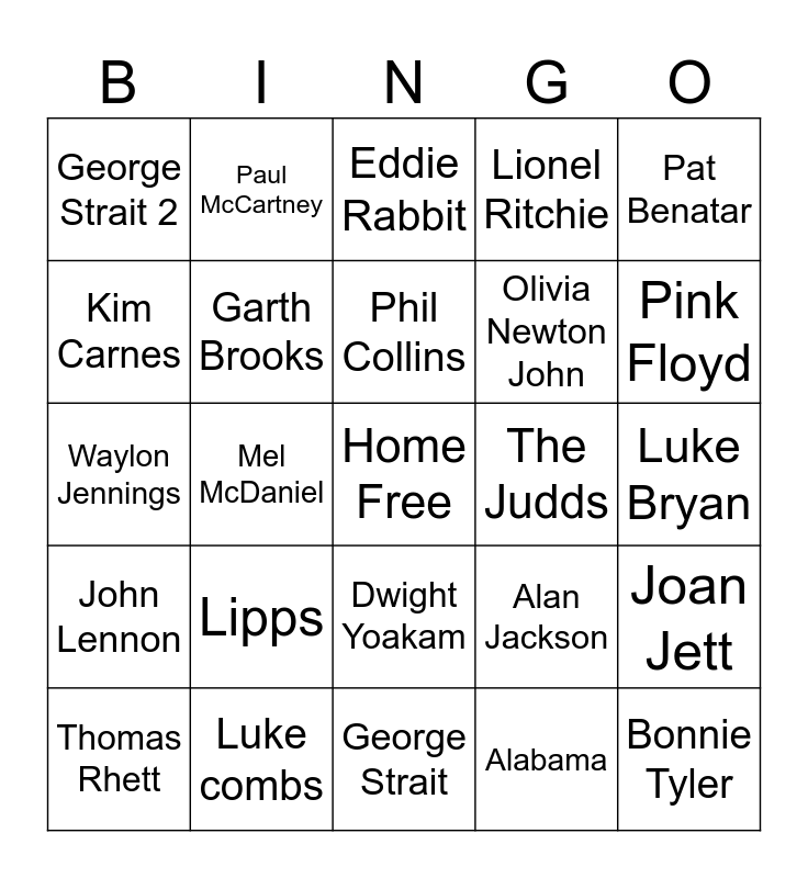 This bingo card has a free space and 27 words: Alan Jackson, Elvis, Olivia Newton John, George Strait, Kim Carnes, Eddie Rabbit, Paul McCartney, John Lennon, The Judds, Joan Jett, Waylon Jennings, Lionel Ritchie, Thomas Rhett, Luke combs, Pink Floyd, Heart, Garth Brooks, Phil Collins, Lipps, George Strait 2, Luke Bryan, Alabama, Mel McDaniel, Bonnie Tyler, Dwight Yoakam, Pat Benatar and Oak Ridge Boys.