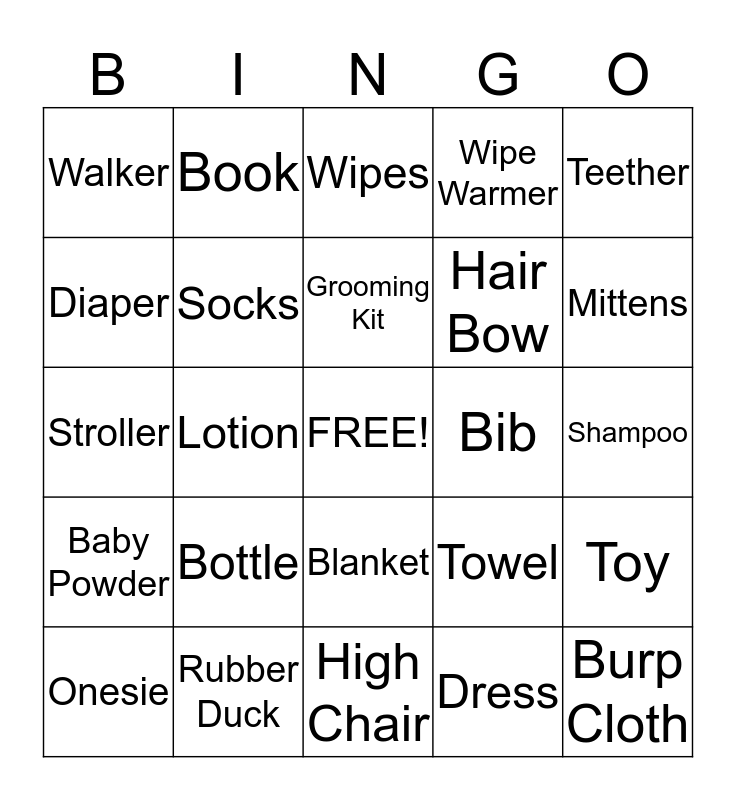 This bingo card has a free space and 25 words: Bottle, High Chair, Grooming Kit, Onesie, Teether, Walker, Diaper, Book, Bib, Blanket, Hair Bow, Stroller, Towel, Toy, Socks, Pacifier, Shampoo, Wipes, Mittens, Lotion, Burp Cloth, Rubber Duck, Baby Powder, Wipe Warmer and Dress.
