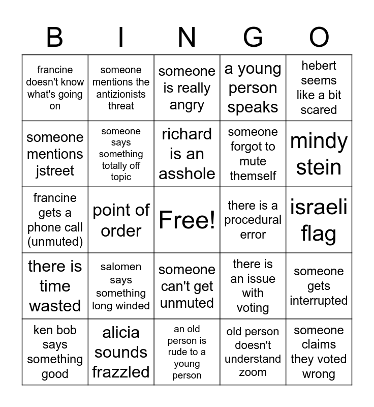 This bingo card has a free space and 24 words: salomen says something long winded, alicia sounds frazzled, richard is an asshole, ken bob says something good, hebert seems like a bit scared, francine doesn't know what's going on, someone mentions jstreet, someone mentions the antizionists threat, there is a procedural error, someone can't get unmuted, someone forgot to mute themself, francine gets a phone call (unmuted), there is an issue with voting, someone gets interrupted, someone says something totally off topic, old person doesn't understand zoom, israeli flag, someone is really angry, mindy stein, point of order, someone claims they voted wrong, there is time wasted, a young person speaks and an old person is rude to a young person.