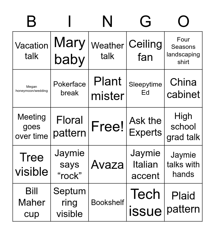 This bingo card has a free space and 24 words: Jaymie says “rock”, Septum ring visible, Plant mister, Bill Maher cup, Four Seasons landscaping shirt, Vacation talk, Megan honeymoon/wedding, Mary baby, Ask the Experts, Avaza, Sleepytime Ed, Meeting goes over time, Jaymie Italian accent, Jaymie talks with hands, Pokerface break, Tech issue, High school grad talk, Weather talk, China cabinet, Floral pattern, Plaid pattern, Tree visible, Ceiling fan and Bookshelf.