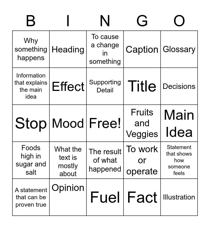 This bingo card has a free space and 24 words: What the text is mostly about, Opinion, Supporting Detail, A statement that can be proven true, Glossary, Why something happens, Information that explains the main idea, Heading, Fruits and Veggies, The result of what happened, Title, Stop, To work or operate, Statement that shows how someone feels, Effect, Fact, Main Idea, To cause a change in something, Decisions, Mood, Illustration, Foods high in sugar and salt, Caption and Fuel.