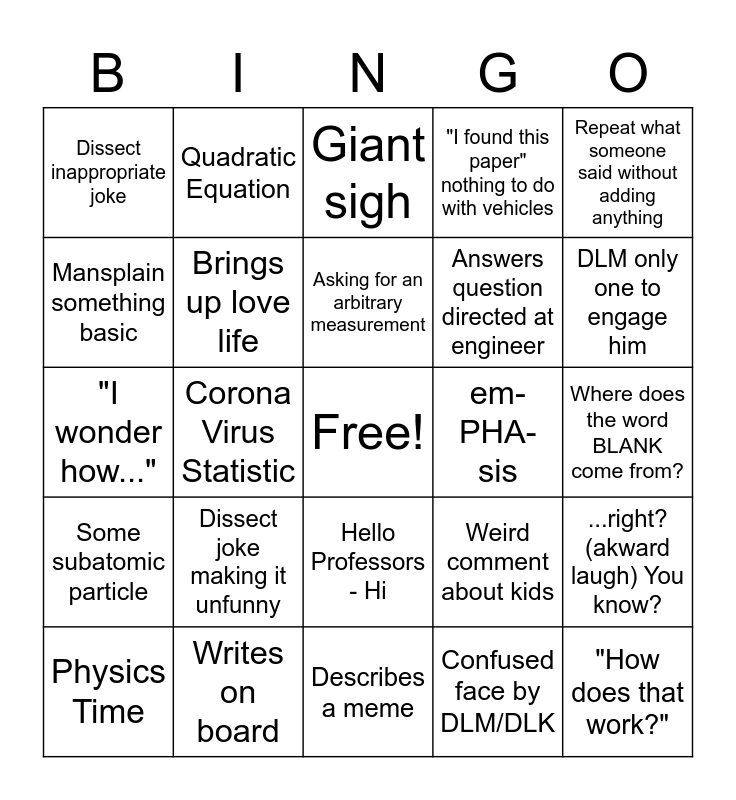 This bingo card has a free space and 24 words: Dissect joke making it unfunny, Writes on board, Asking for an arbitrary measurement, Physics Time, Repeat what someone said without adding anything, Dissect inappropriate joke, Mansplain something basic, Quadratic Equation, em-PHA-sis, Hello Professors - Hi, Answers question directed at engineer, "I wonder how...", Weird comment about kids, ...right? (akward laugh) You know?, Brings up love life, Confused face by DLM/DLK, Where does the word BLANK come from?, Giant sigh, DLM only one to engage him, Corona Virus Statistic, "How does that work?", Some subatomic particle, "I found this paper" nothing to do with vehicles and Describes a meme.