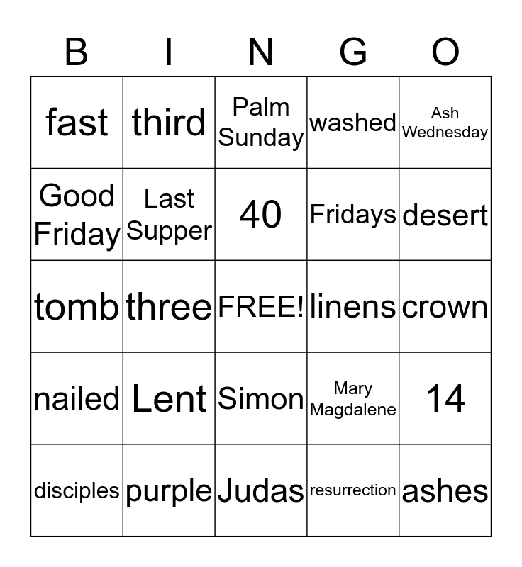 This bingo card has a free space and 24 words: Lent, purple, 40, disciples, Ash Wednesday, fast, Good Friday, third, linens, Simon, Fridays, tomb, Mary Magdalene, 14, Last Supper, resurrection, crown, Palm Sunday, desert, three, ashes, nailed, washed and Judas.