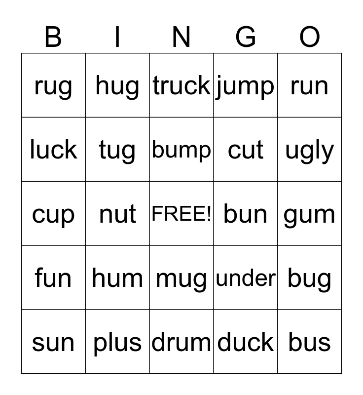 This bingo card has a free space and 24 words: hum, plus, bump, sun, run, rug, luck, hug, bun, mug, cut, cup, under, bug, tug, duck, gum, truck, ugly, nut, bus, fun, jump and drum.