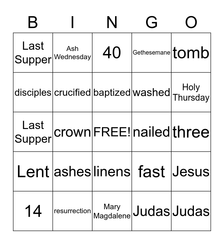 This bingo card has a free space and 32 words: Judas, Jerusalem, crown, Easter, Lent, crucified, tomb, Jesus, Ash Wednesday, Good Friday, baptized, 40, purple, asleep, nailed, Palm Sunday, 14, Last Supper, linens, ashes, fast, Simon, three, resurrection, Judas, Gethesemane, washed, disciples, Last Supper, Mary Magdalene, desert and Holy Thursday.