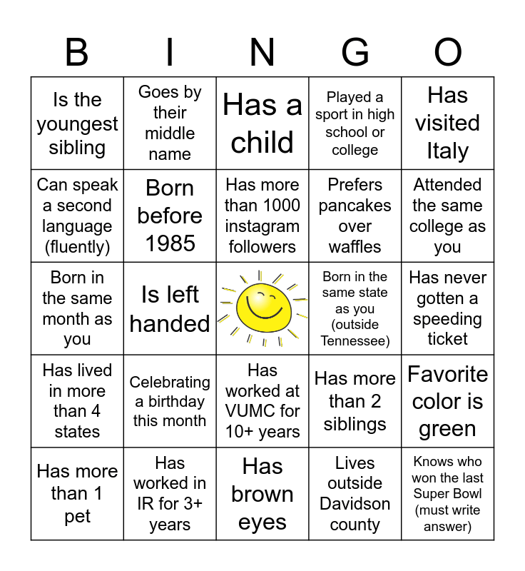 This bingo card has a free space and 24 words: Celebrating a birthday this month, Has worked in IR for 3+ years, Has more than 1000 instagram followers, Has more than 1 pet, Has visited Italy, Is the youngest sibling, Can speak a second language (fluently), Goes by their middle name, Born in the same state as you (outside Tennessee), Has worked at VUMC for 10+ years, Prefers pancakes over waffles, Born in the same month as you, Has more than 2 siblings, Favorite color is green, Born before 1985, Lives outside Davidson county, Has never gotten a speeding ticket, Has a child, Attended the same college as you, Is left handed, Knows who won the last Super Bowl (must write answer), Has lived in more than 4 states, Played a sport in high school or college and Has brown eyes.