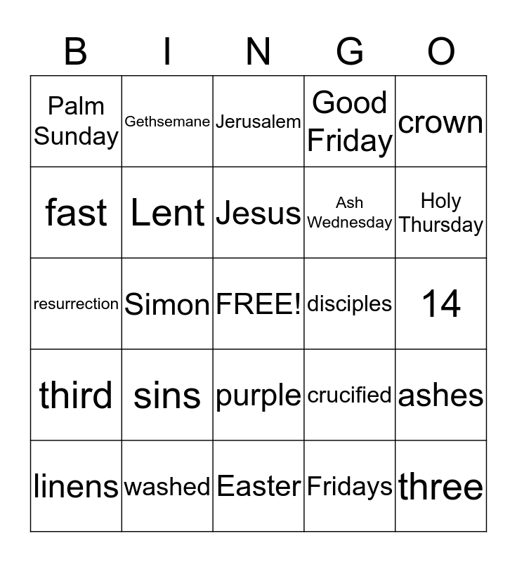 This bingo card has a free space and 31 words: Easter, baptized, Simon, nailed, Palm Sunday, Jerusalem, Lent, crucified, disciples, Fridays, 14, three, Last Supper, desert, Holy Thursday, tomb, ashes, sins, third, purple, crown, alseep, linens, Gethsemane, Ash Wednesday, fast, Good Friday, resurrection, washed, Jesus and Mary Magdalene.