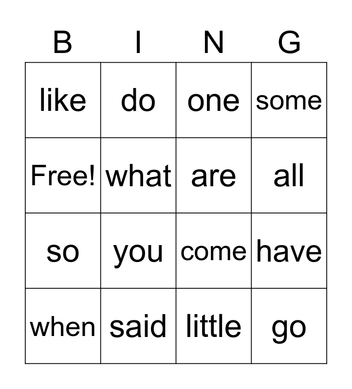 This bingo card has 16 words: said, have, one, like, so, do, come, little, Free!, what, when, some, you, all, are and go.