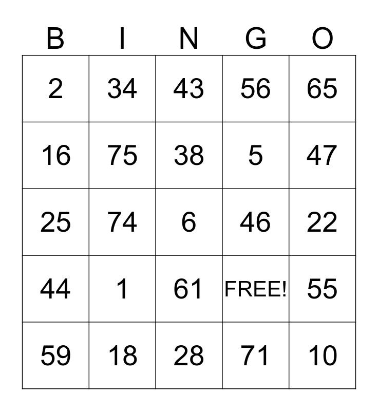 This bingo card has 25 words: 1, 28, 38, 59, 65, 2, 16, 34, 46, 61, 5, 25, FREE!, 55, 75, 10, 22, 43, 47, 74, 6, 18, 44, 56 and 71.