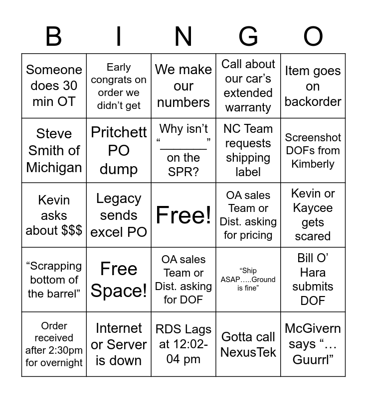 This bingo card has a free space and 25 words: Free Space!, RDS Lags at 12:02-04 pm, Why isn’t “_______” on the SPR?, Order received after 2:30pm for overnight, Item goes on backorder, Someone does 30 min OT, Steve Smith of Michigan, Early congrats on order we didn’t get, OA sales Team or Dist. asking for pricing, OA sales Team or Dist. asking for DOF, NC Team requests shipping label, Kevin asks about $$$, “Ship ASAP…..Ground is fine”, Bill O’ Hara submits DOF, Pritchett PO dump, Matt M. drives to FedEx, Kevin or Kaycee gets scared, We make our numbers, Screenshot DOFs from Kimberly, Legacy sends excel PO, McGivern says “… Guurrl”, Internet or Server is down, “Scrapping bottom of the barrel”, Call about our car’s extended warranty and Gotta call NexusTek.