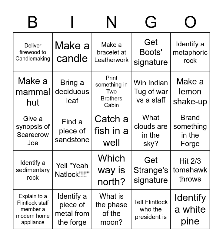 This bingo card has a free space and 24 words: Yell "Yeah Natlock!!!!", Identify a piece of metal from the forge, Print something in Two Brothers Cabin, Explain to a Flintlock staff member a modern home appliance, Identify a metaphoric rock, Deliver firewood to Candlemaking, Make a mammal hut, Make a candle, What clouds are in the sky?, Which way is north?, Win Indian Tug of war vs a staff, Give a synopsis of Scarecrow Joe, Get Strange's signature, Hit 2/3 tomahawk throws, Bring a deciduous leaf, Tell Flintlock who the president is, Brand something in the Forge, Make a bracelet at Leatherwork, Make a lemon shake-up, Find a piece of sandstone, Identify a white pine, Identify a sedimentary rock, Get Boots' signature and What is the phase of the moon?.
