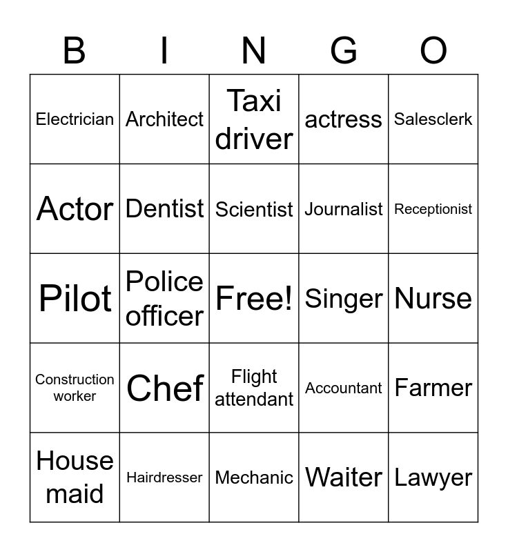 This bingo card has a free space and 30 words: Hairdresser, Tour guide, Police officer, Doctor, Electrician, Taxi driver, Dentist, Flight attendant, Singer, Mechanic, Nurse, Lawyer, Waiter, Waitress, Receptionist, Business person, Accountant, Construction worker, Chef, Salesclerk, Pilot, Self-employed, Architect, Journalist, Actor, actress, Farmer, House maid, Scientist and Paramedic.