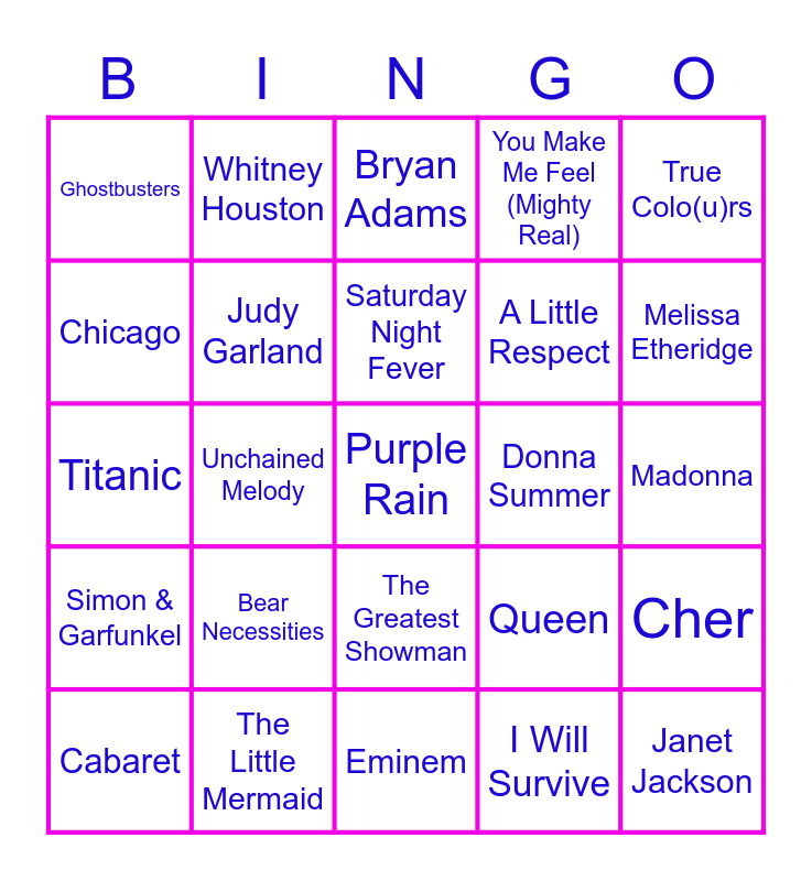 This bingo card has 60 words: The Lion King, The Little Mermaid, Aladdin, Donna Summer, The Village People, Let It Go, Judy Garland, Singin' in the Rain, You Make Me Feel (Mighty Real), George Michael, Chicago, Grease, Saturday Night Fever, We Are Family, I'm Coming Out, Ghostbusters, Unchained Melody, Bryan Adams, ABBA, Melissa Etheridge, Titanic, Whitney Houston, Eminem, Queen, KD Lang, Will Smith, Flashdance, Dirty Dancing, A Little Respect, Relax, Mary Poppins, Because You Loved Me, Rocky III, Pet Shop Boys, True Colo(u)rs, Cabaret, Goo Goo Dolls, Purple Rain, Rupaul, Madonna, Beauty & the Beast, Bear Necessities, The Greatest Showman, Don't Leave Me This Way, Janet Jackson, Philadelphia, The Sound of Music, Moulin Rouge, Let's Have A Kiki, Cher, Simon & Garfunkel, Footloose, Gangsta's Paradise, Christina Aguilera, Born This Way, Mission Impossible, Destiny's Child, A Star is Born, I Will Survive and It's Raining Men.
