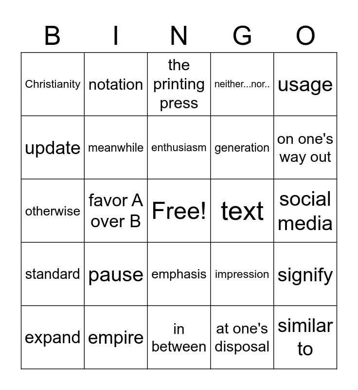 This bingo card has a free space and 24 words: pause, empire, enthusiasm, expand, usage, Christianity, update, notation, text, emphasis, generation, otherwise, impression, signify, meanwhile, at one's disposal, social media, the printing press, on one's way out, favor A over B, similar to, standard, neither...nor.. and in between.
