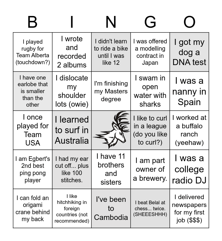 This bingo card has a free space and 24 words: I had my ear cut off... plus like 100 stitches., I like hitchhiking in foreign countries (not recommended), I'm finishing my Masters degree, I can fold an origami crane behind my back, I got my dog a DNA test, I played rugby for Team Alberta (touchdown?), I have one earlobe that is smaller than the other, I wrote and recorded 2 albums, I like to curl in a league (do you like to curl?), I have 11 brothers and sisters, I swam in open water with sharks, I once played for Team USA, I am part owner of a brewery., I was a college radio DJ, I dislocate my shoulder lots (owie), I beat Belal at chess... twice. (SHEEESHHH), I worked at a buffalo ranch (yeehaw), I didn't learn to ride a bike until I was like 12, I was a nanny in Spain, I learned to surf in Australia, I delivered newspapers for my first job ($$$), I am Egbert's 2nd best ping pong player, I was offered a modelling contract in Japan and I've been to Cambodia.
