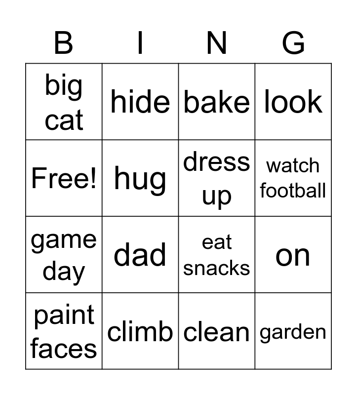 This bingo card has 16 words: climb, on, bake, big cat, game day, hide, eat snacks, clean, Free!, hug, paint faces, look, dad, watch football, dress up and garden.