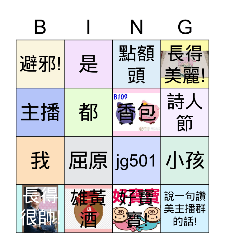 This bingo card has 5 images and 16 words: 雄黃酒, 小孩, 點額頭, 避邪!, 我, 是, jg501, 好寶寶!, 主播, 都, 長得很帥!, 長得美麗!, 屈原, 詩人節, 香包 and 說一句讚美主播群的話!.
