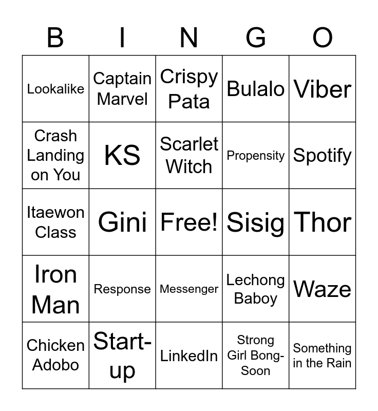 This bingo card has a free space and 24 words: Response, Start-up, Scarlet Witch, Chicken Adobo, Viber, Lookalike, Crash Landing on You, Captain Marvel, Sisig, Messenger, Propensity, Itaewon Class, Lechong Baboy, Waze, KS, Strong Girl Bong-Soon, Thor, Crispy Pata, Spotify, Gini, Something in the Rain, Iron Man, Bulalo and LinkedIn.