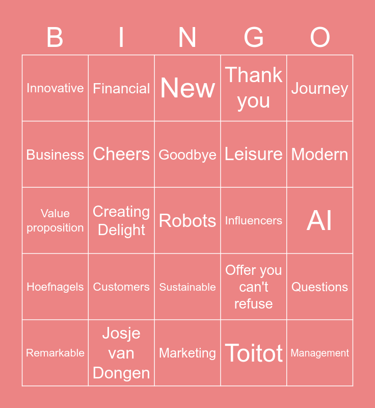 This bingo card has 30 words: Josje van Dongen, Minor, Creating Delight, Concept, Innovative, New, Cheers, Sustainable, Influencers, Marketing, AI, Robots, Toitot, Management, Modern, Technolog, Offer you can't refuse, Hoefnagels, Customers, Journey, Value proposition, Business model, Financial, Leisure, Business, Thank you, Questions, Remarkable, Goodbye and Welcome.