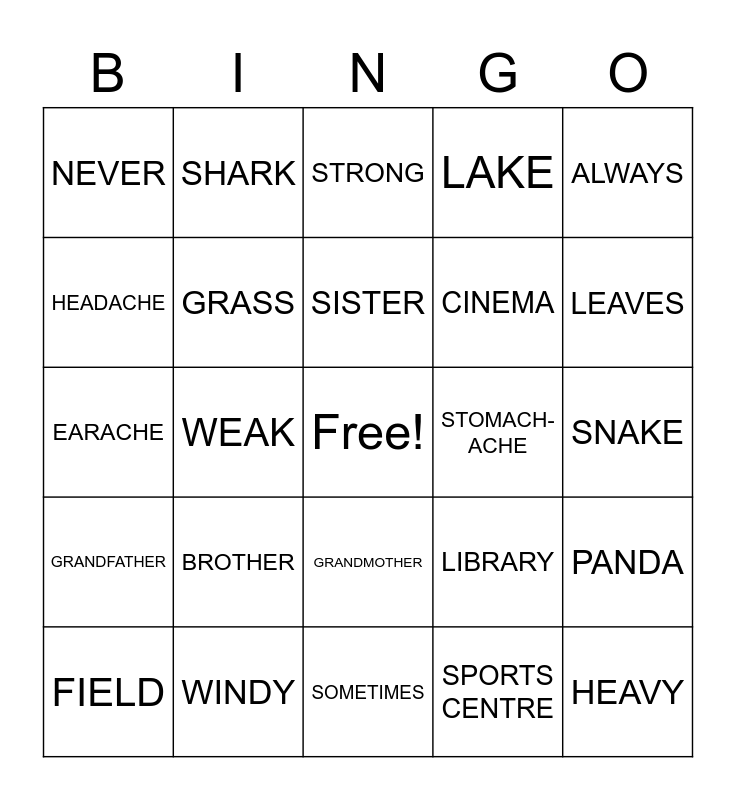 This bingo card has a free space and 24 words: BROTHER, WINDY, SISTER, FIELD, ALWAYS, NEVER, HEADACHE, SHARK, STOMACH-ACHE, GRANDMOTHER, CINEMA, EARACHE, LIBRARY, PANDA, GRASS, SPORTS CENTRE, SNAKE, STRONG, LEAVES, WEAK, HEAVY, GRANDFATHER, LAKE and SOMETIMES.