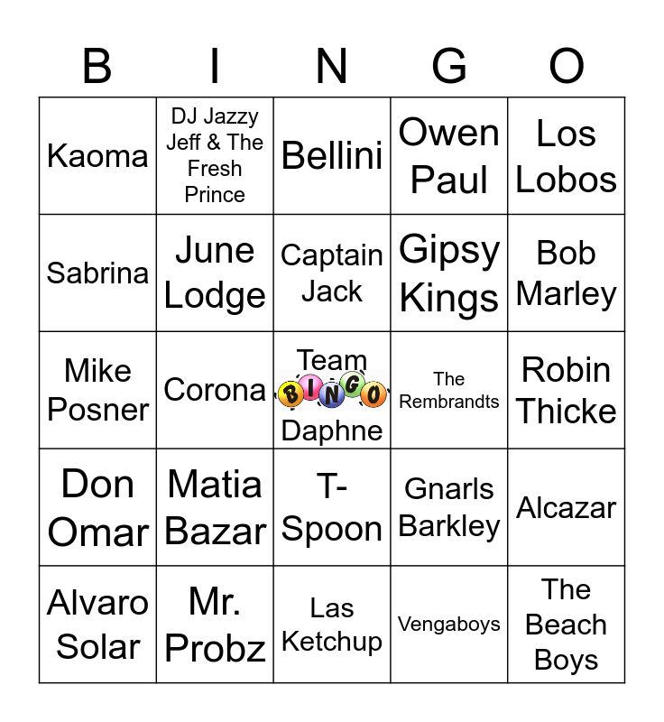 This bingo card has a free space and 50 words: Gloria Estefan, The Beach Boys, Mr. President, Las Ketchup, Matia Bazar, Mungo Jerry, DJ Jazzy Jeff & The Fresh Prince, Dr. Alban, Sabrina, Tony Esposito, June Lodge, Owen Paul, Alcazar, Gnarls Barkley, Wham!, Juenes, Captain Jack, The Rembrandts, Lionel Richie, Los Lobos, Corona, Vengaboys, Kaoma, Gipsy Kings, Bob Sinclar, Jimmy Cliff, Bob Marley, Guus Meeuwis, Bellini, T-Spoon, Inna, Billy Ocean, Michel Teló, Maxi Priest, Mr. Probz, Calvin Harris, Jayh, Swifty Official, Pharrell Williams, Robin Thicke, Desireless, Kenny B, Nicky Jam, Jason Derulo, Alvaro Solar, Mike Posner, Luis Fonsi, Armin van Buuren, Don Omar and Ruud Gullit.