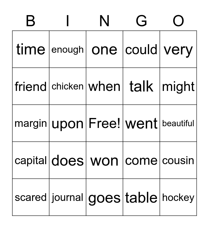 This bingo card has a free space and 50 words: house, hockey, friend, goes, does, earth, enough, find, friend, excited, chicken, could, cousin, come, would, walk, when, went, victory, very, upon, table, time, talk, truck, make, might, once, one, won, our, hour, probably, kept, journal, should, said, really, breakfast, beautiful, birthday, awesome, actually, school, scared, margin, paragraph, period, capital and indent.