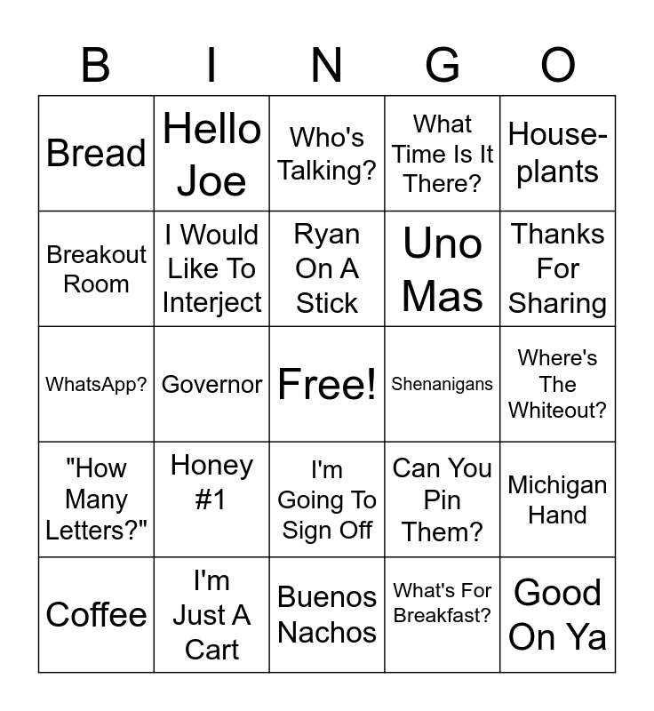 This bingo card has a free space and 24 words: Honey #1, I'm Just A Cart, Ryan On A Stick, Coffee, House-plants, Bread, Breakout Room, Hello Joe, Shenanigans, I'm Going To Sign Off, Uno Mas, WhatsApp?, Can You Pin Them?, Michigan Hand, I Would Like To Interject, What's For Breakfast?, Where's The Whiteout?, Who's Talking?, Thanks For Sharing, Governor, Good On Ya, "How Many Letters?", What Time Is It There? and Buenos Nachos.