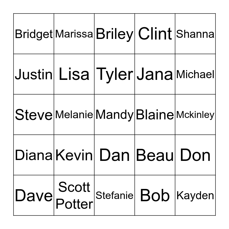 This bingo card has 25 words: Kevin, Stefanie, Tyler, Dave, Shanna, Bridget, Justin, Marissa, Blaine, Dan, Jana, Steve, Beau, Don, Lisa, Kayden, Mckinley, Briley, Michael, Melanie, Mandy, Scott Potter, Diana, Clint and Bob.