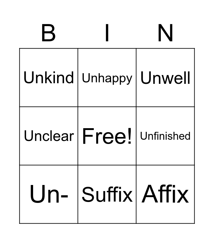 This bingo card has a free space and 11 words: Prefix, Suffix, Affix, Un-, Unhappy, Unwell, Unfinished, Unable, Unclear, Unkind and Unbelievable.