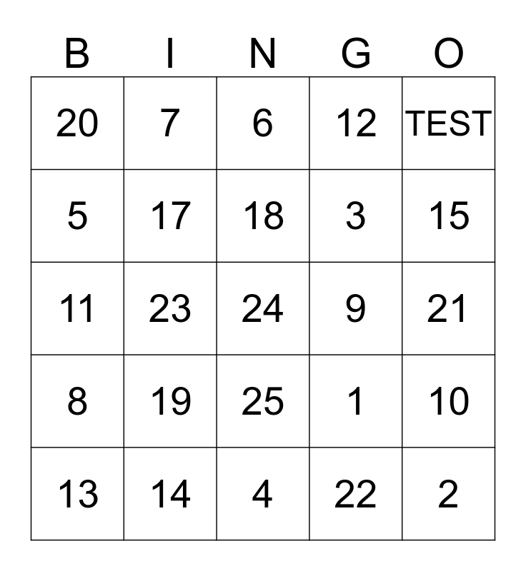 This bingo card has 27 words: 1, 2, 3, 4, 5, 6, 7, 8, 9, 10, 11, 12, 13, 14, 15, 16, 17, 18, 19, 20, 21, 22, 23, 24, 25, TEST and TEST 2.