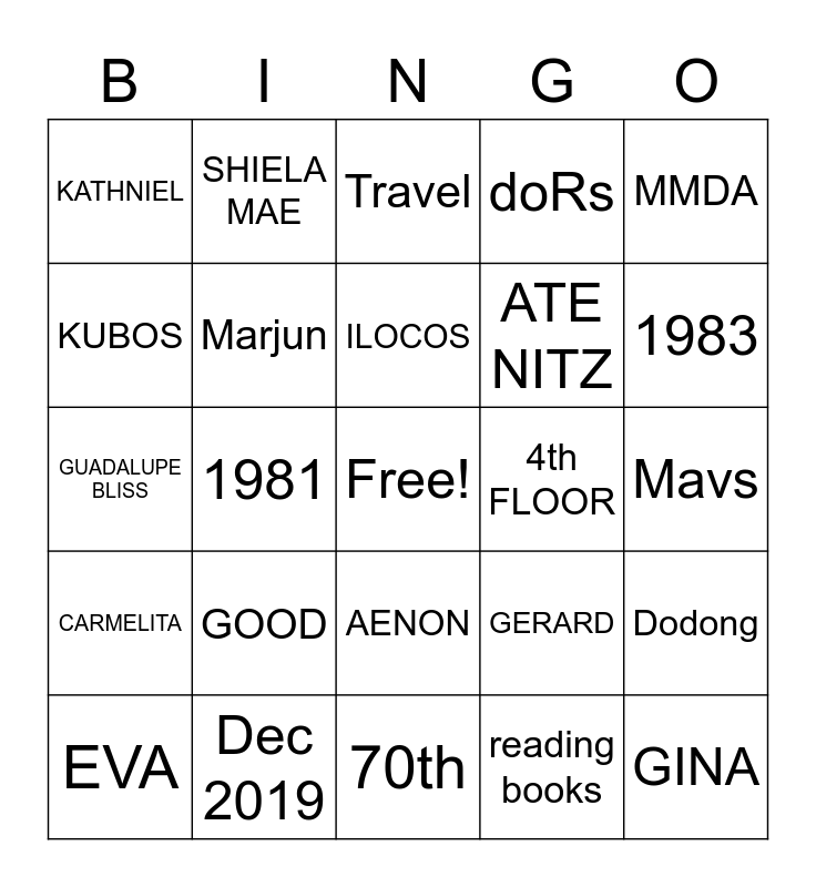 This bingo card has a free space and 25 words: GOOD, 70th, ILOCOS, EVA, MMDA, KATHNIEL, KUBOS, SHIELA MAE, 4th FLOOR, AENON, ATE NITZ, GUADALUPE BLISS, GERARD, Dodong, Marjun, Jay, Mavs, Travel, 1983, 1981, GINA, Dec 2019, CARMELITA, doRs and reading books.