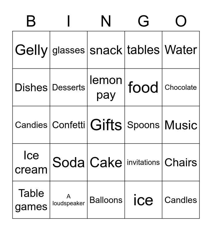 This bingo card has a free space and 24 words: Soda, A loudspeaker, lemon pay, Table games, Water, Gelly, Dishes, glasses, Spoons, Cake, food, Candies, invitations, Chairs, Desserts, ice, Music, snack, Chocolate, Confetti, Candles, Ice cream, tables and Balloons.