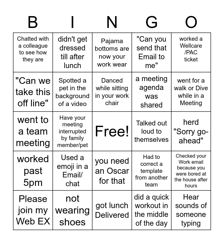 This bingo card has a free space and 29 words: Please join my Web EX, Say "Sorry - I was on mute", Have your meeting interrupted by family member/pet, Ask "Can everyone see my screen?", Chatted with a colleague to see how they are, Pajama bottoms are now your work wear, Spotted a pet in the background of a video, Used a emoji in a Email/ chat, Talked out loud to themselves, not wearing shoes, herd "Sorry go-ahead", Hear sounds of someone typing, got lunch Delivered, did a quick workout in the middle of the day, went for a walk or Dive while in a Meeting, took a coffee brake, you need an Oscar for that, worked past 5pm, worked a Wellcare /PAC ticket, went to a team meeting, Had to correct a template from another team, worked in a different room just to have a change, a meeting agenda was shared, "Can we take this off line", "Can you send that Email to me", didn't get dressed till after lunch, Checked your Work email because you were bored at the house after hours, Danced while sitting in your work chair and Lose VPN/ internet.