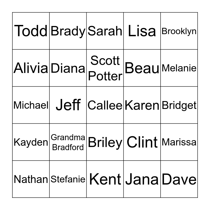 This bingo card has 25 words: Grandma Bradford, Kent, Scott Potter, Nathan, Brooklyn, Todd, Alivia, Brady, Karen, Briley, Beau, Michael, Clint, Marissa, Diana, Dave, Bridget, Sarah, Melanie, Jeff, Callee, Stefanie, Kayden, Lisa and Jana.