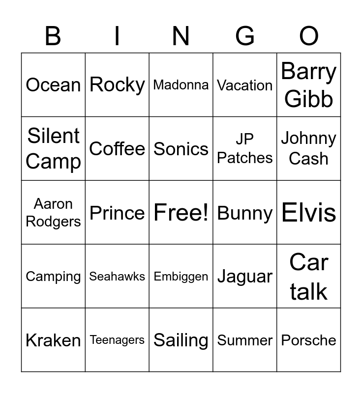 This bingo card has a free space and 24 words: Seahawks, Teenagers, Sonics, Kraken, Barry Gibb, Ocean, Silent Camp, Rocky, Bunny, Embiggen, JP Patches, Aaron Rodgers, Jaguar, Car talk, Coffee, Summer, Elvis, Madonna, Johnny Cash, Prince, Porsche, Camping, Vacation and Sailing.