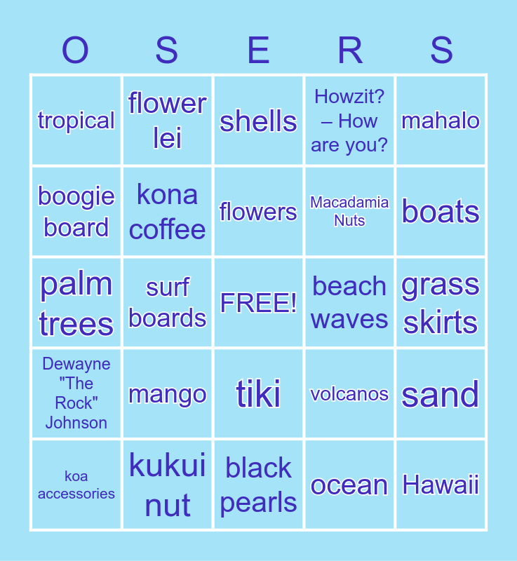 This bingo card has a free space and 42 words: flip flops, flowers, pineapple, mango, ocean, sand, Hawaii, aloha, shells, tiki, grass skirts, boats, surf boards, mahalo, torch, volcanos, island, palm trees, limbo, flower lei, boogie board, sun glasses, beach ball, tropical, sunset, ice cream, Macadamia Nuts, ukulekle, Honolulu, Waikiki, koloa rum, Dewayne "The Rock" Johnson, kona coffee, black pearls, hawaiian jewelry, koa accessories, kukui nut, beach waves, hula, Honu – Green sea turtle, Howzit? – How are you? and ohana - family.