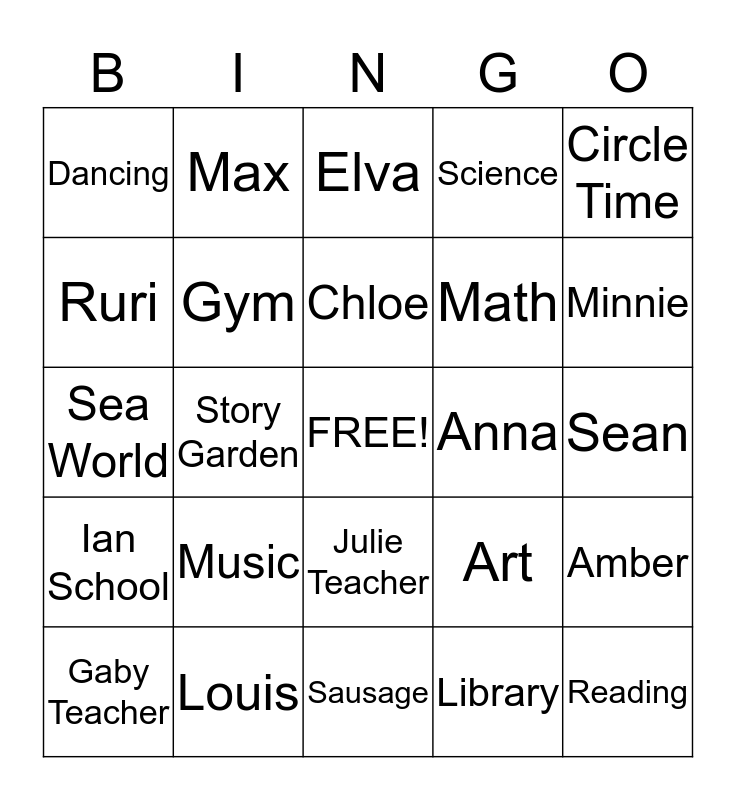 This bingo card has a free space and 24 words: Music, Louis, Chloe, Gaby Teacher, Circle Time, Dancing, Ruri, Max, Anna, Julie Teacher, Math, Sea World, Art, Amber, Gym, Library, Sean, Elva, Minnie, Story Garden, Reading, Ian School, Science and Sausage.