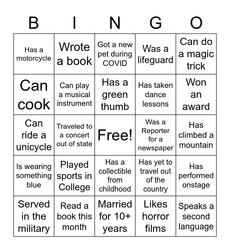 This bingo card has a free space and 24 words: Played sports in College, Read a book this month, Has a green thumb, Served in the military, Can do a magic trick, Has a motorcycle, Can cook, Wrote a book, Was a Reporter for a newspaper, Has a collectible from childhood, Has taken dance lessons, Can ride a unicycle, Has yet to travel out of the country, Has performed onstage, Can play a musical instrument, Likes horror films, Has climbed a mountain, Got a new pet during COVID, Won an award, Traveled to a concert out of state, Speaks a second language, Is wearing something blue, Was a lifeguard and Married for 10+ years.