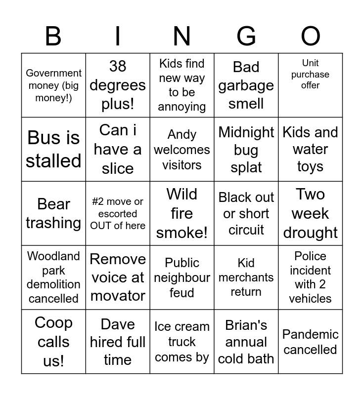This bingo card has a free space and 24 words: Remove voice at movator, Dave hired full time, Andy welcomes visitors, Coop calls us!, Unit purchase offer, Government money (big money!), Bus is stalled, 38 degrees plus!, Black out or short circuit, Public neighbour feud, Midnight bug splat, Bear trashing, Kid merchants return, Police incident with 2 vehicles, Can i have a slice, Brian's annual cold bath, Two week drought, Kids find new way to be annoying, Kids and water toys, #2 move or escorted OUT of here, Pandemic cancelled, Woodland park demolition cancelled, Bad garbage smell and Ice cream truck comes by.