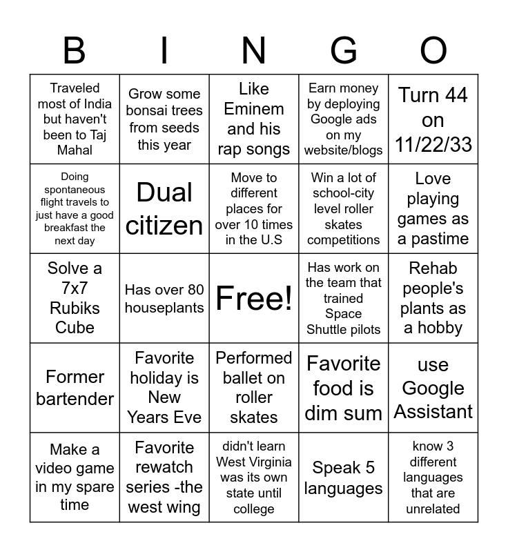 This bingo card has a free space and 33 words: Hasn't had breakfast today, Enjoys maths, Has over 80 houseplants, Has two dogs, Former bartender, Dual citizen, Turn 44 on 11/22/33, Make a video game in my spare time, Grow some bonsai trees from seeds this year, Make presentation about Google founders in high school English class, Move to different places for over 10 times in the U.S, Like Eminem and his rap songs, Advisor to the Icelandic government., Co-author of a NYT bestseller in 2019, Has work on the team that trained Space Shuttle pilots, Love playing games as a pastime, Favorite rewatch series -the west wing, Solve a 7x7 Rubiks Cube, Favorite holiday is New Years Eve, Favorite food is dim sum, Performed ballet on roller skates, Love chocolates, Traveled most of India but haven't been to Taj Mahal, Rehab people's plants as a hobby, didn't learn West Virginia was its own state until college, know 3 different languages that are unrelated, Earn money by deploying Google ads on my website/blogs, Win a lot of school-city level roller skates competitions, Doing spontaneous flight travels to just have a good breakfast the next day, use Google Assistant, My spouse and I attended the same kindergarten school, Speak 5 languages and Visit around 15 offices of Google at least once.